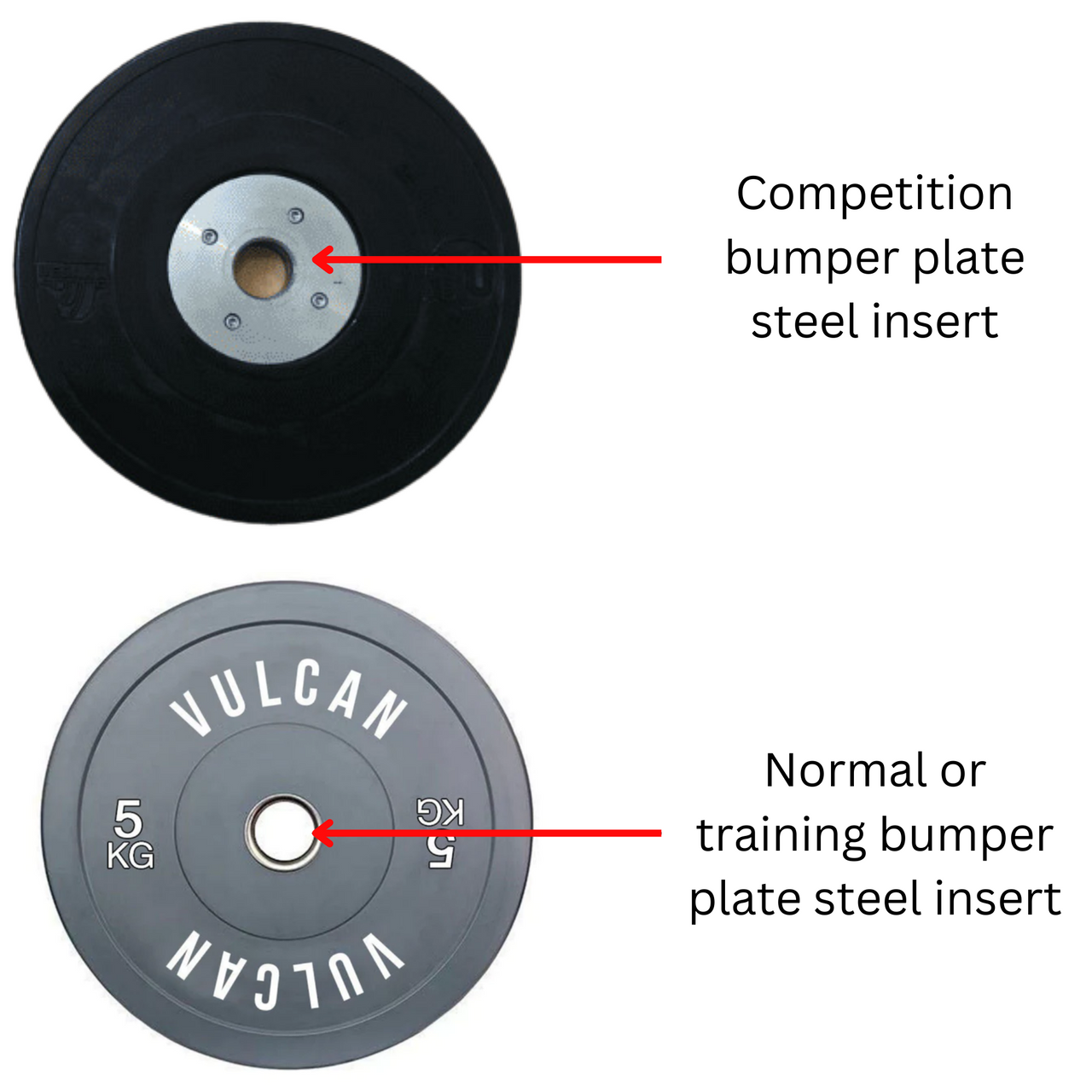 A competition bumper plate is similar to a normal bumper plate, except it features a large stainless steel insert in the centre of the plate (which is much larger than the steel ring in a normal bumper plate). This helps to reinforce the plate and prevent it from warping over time, especially when the plates are being dropped frequently. The rest of the plate is made up of high-density rubber. Competition plates are thinner than a rubber bumper plate, allowing you to fit more weight onto the sleeve of the bar.