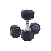 Classic, rubber coated hex design that is quiet and easy on the floors. The hex design also eliminates rolling and makes for easy storage in your gym.