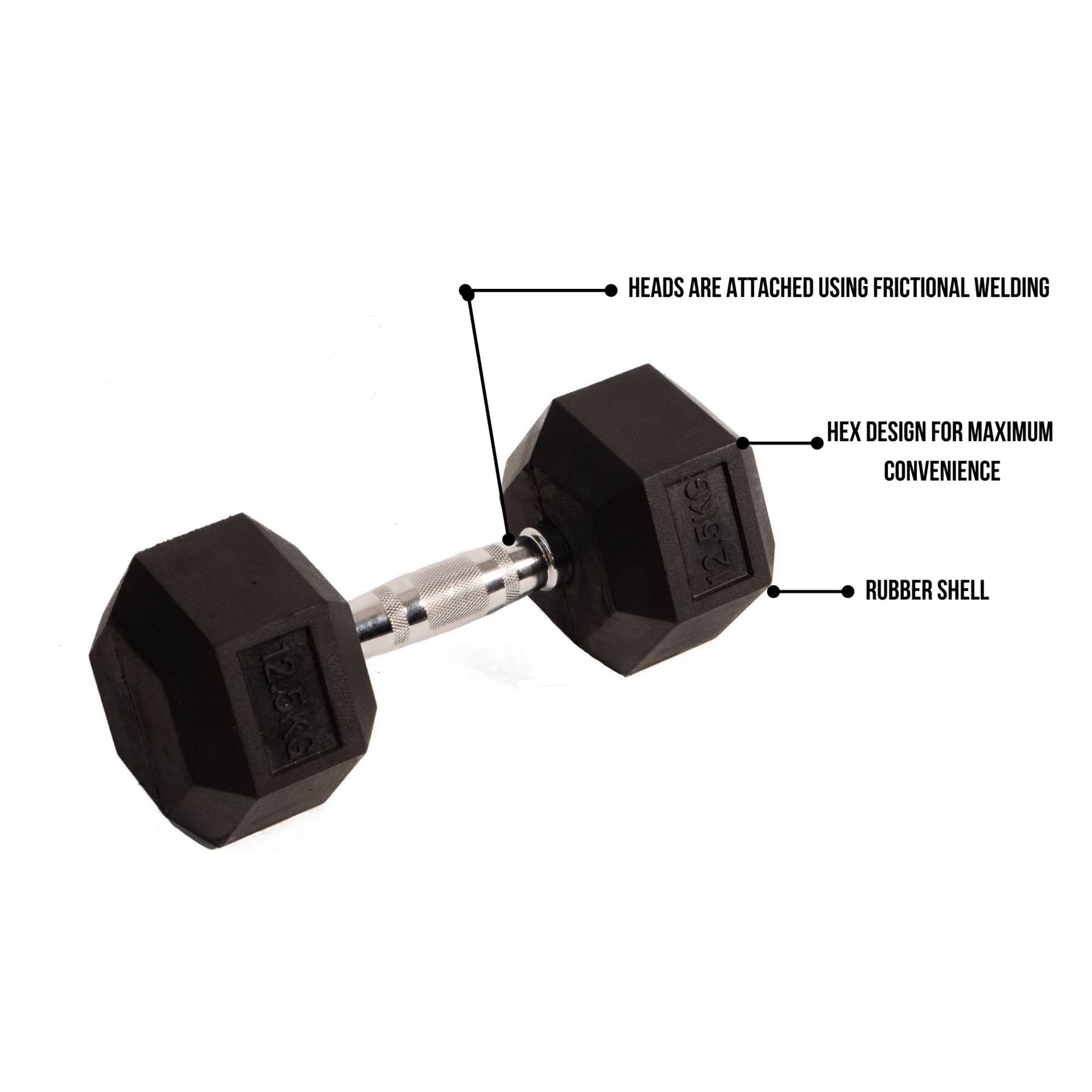 Frictional Welding: Our dumbbells are made from 100% natural rubber and heads are attached using friction welding (rather than electrical welding) ensuring a highly durable product.