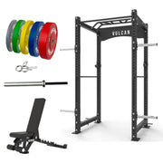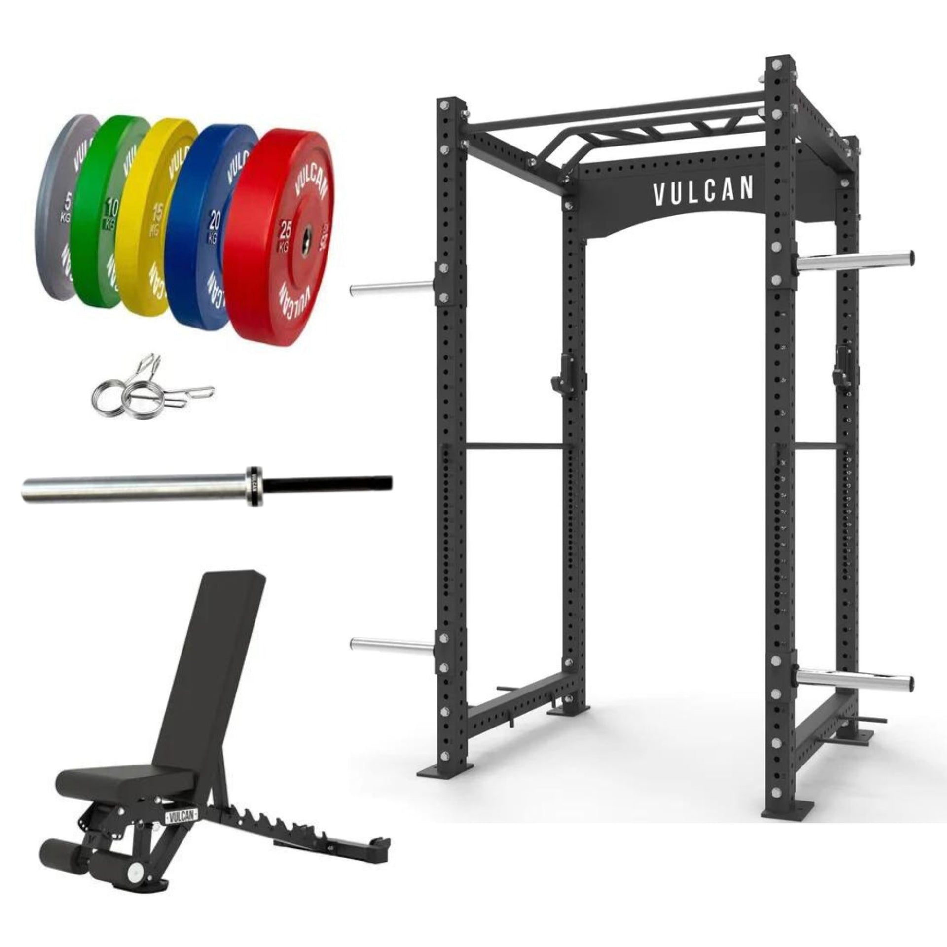 VULCAN Commercial Power Cage, Olympic Barbell, 150kg Colour Bumper Weight Plates & Commercial FID Bench | IN STOCK