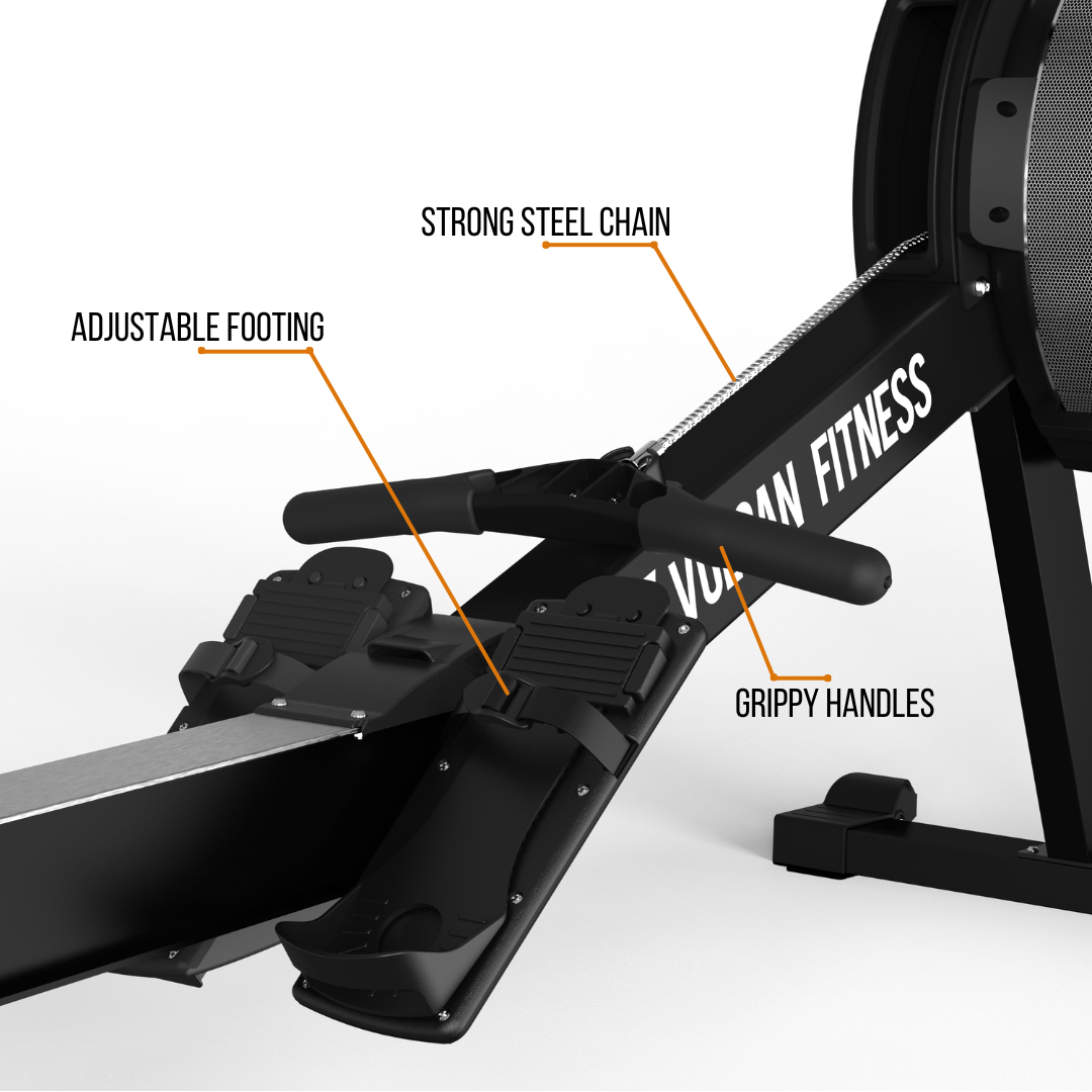 The VULCAN Aeromax Rowing Machine has many great features! Such as Durable grippy handles which fit the hand nicely, strong quiet chains, Big LCD monitor, Air resistance fan and a light but durable frame.
