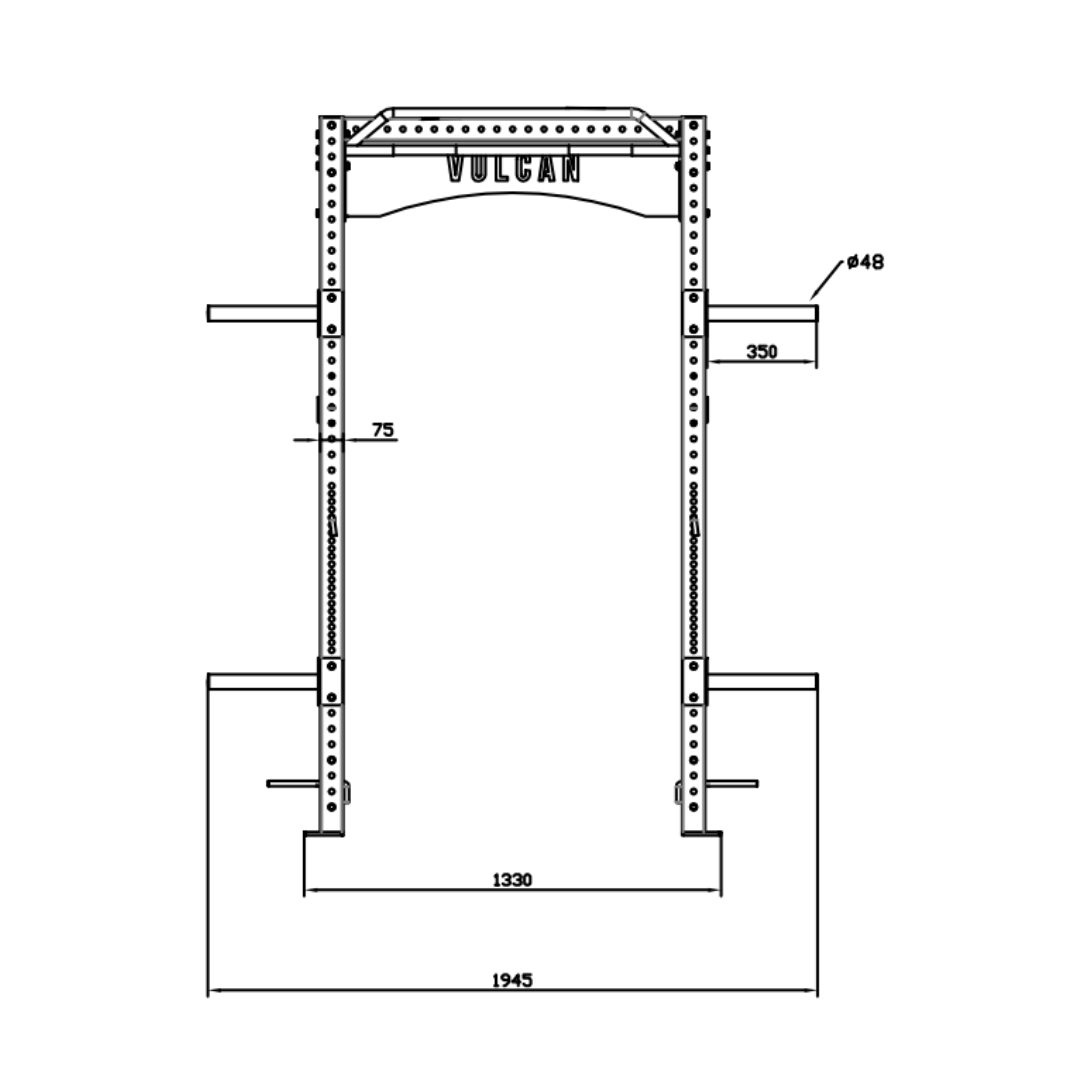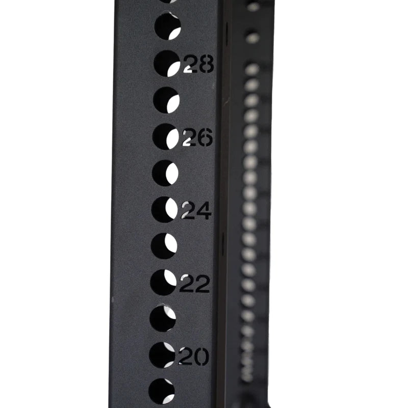 Gap between the holes is 25mm allowing for precise placement of safety arms and j-hooks. Particularly important for when setting your safety spotters to the correct height.