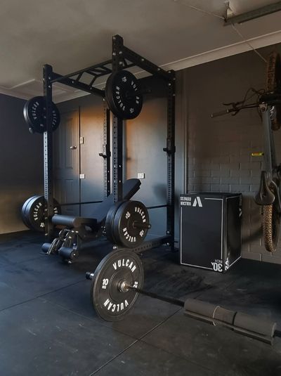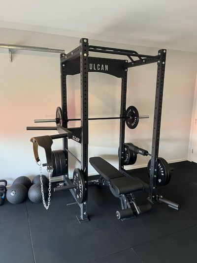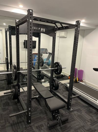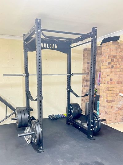 VULCAN Commercial Power Cage, Olympic Barbell, 100kg Black Bumper Weight Plates & Commercial FID Bench | IN STOCK