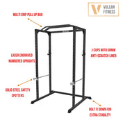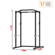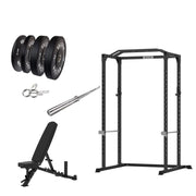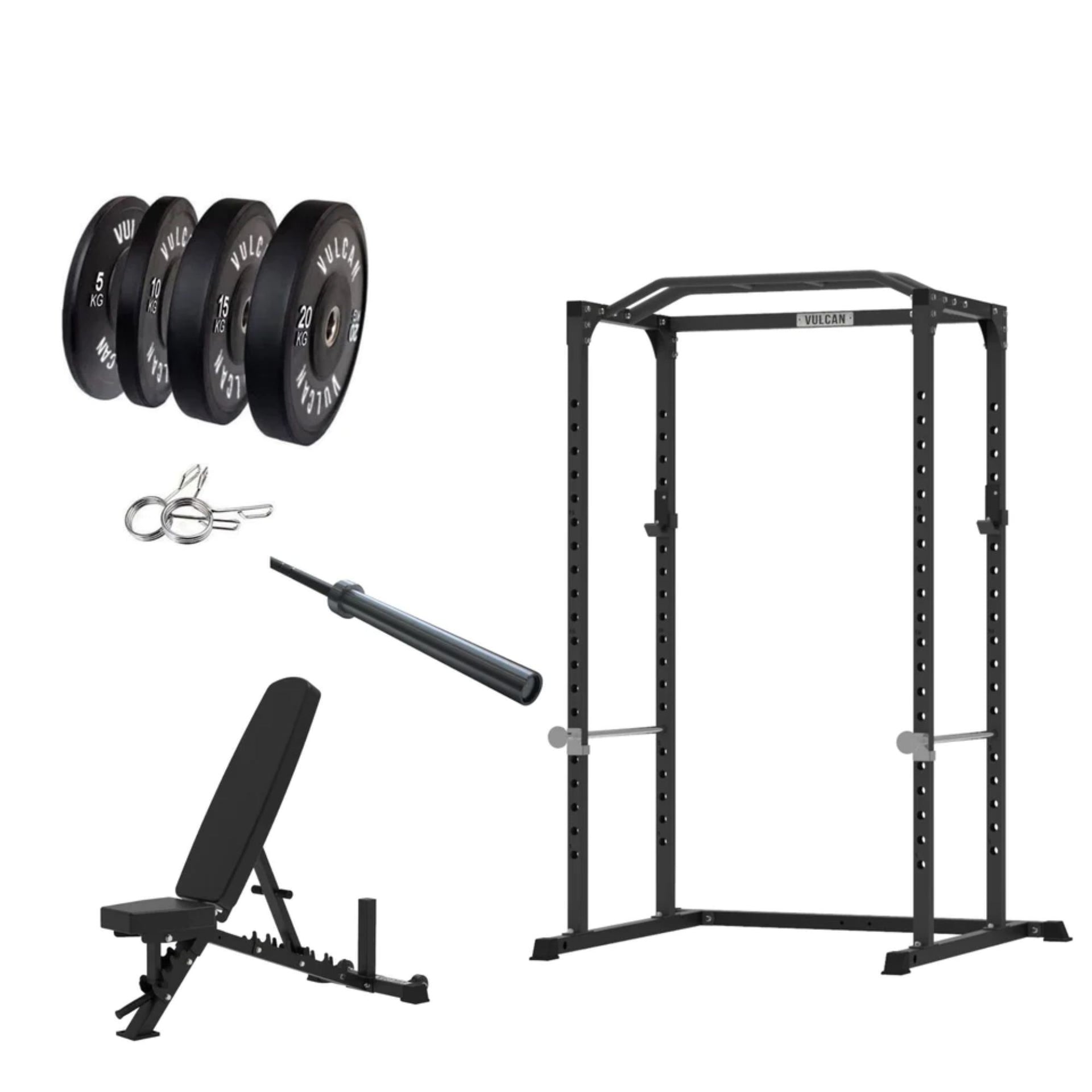 VULCAN Home Gym Power Cage, Olympic Barbell, 100kg Black Bumper Weight Plates & Pro Adjustable Bench | IN STOCK