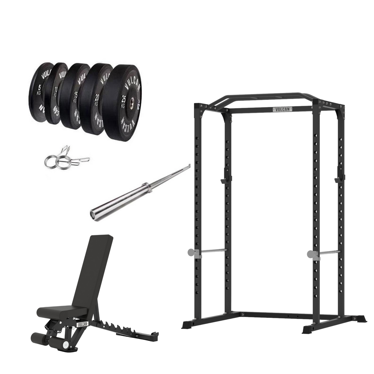 VULCAN Home Gym Power Cage, Olympic Barbell, 150kg Black Bumper Weight Plates & Commercial FID Bench | IN STOCK