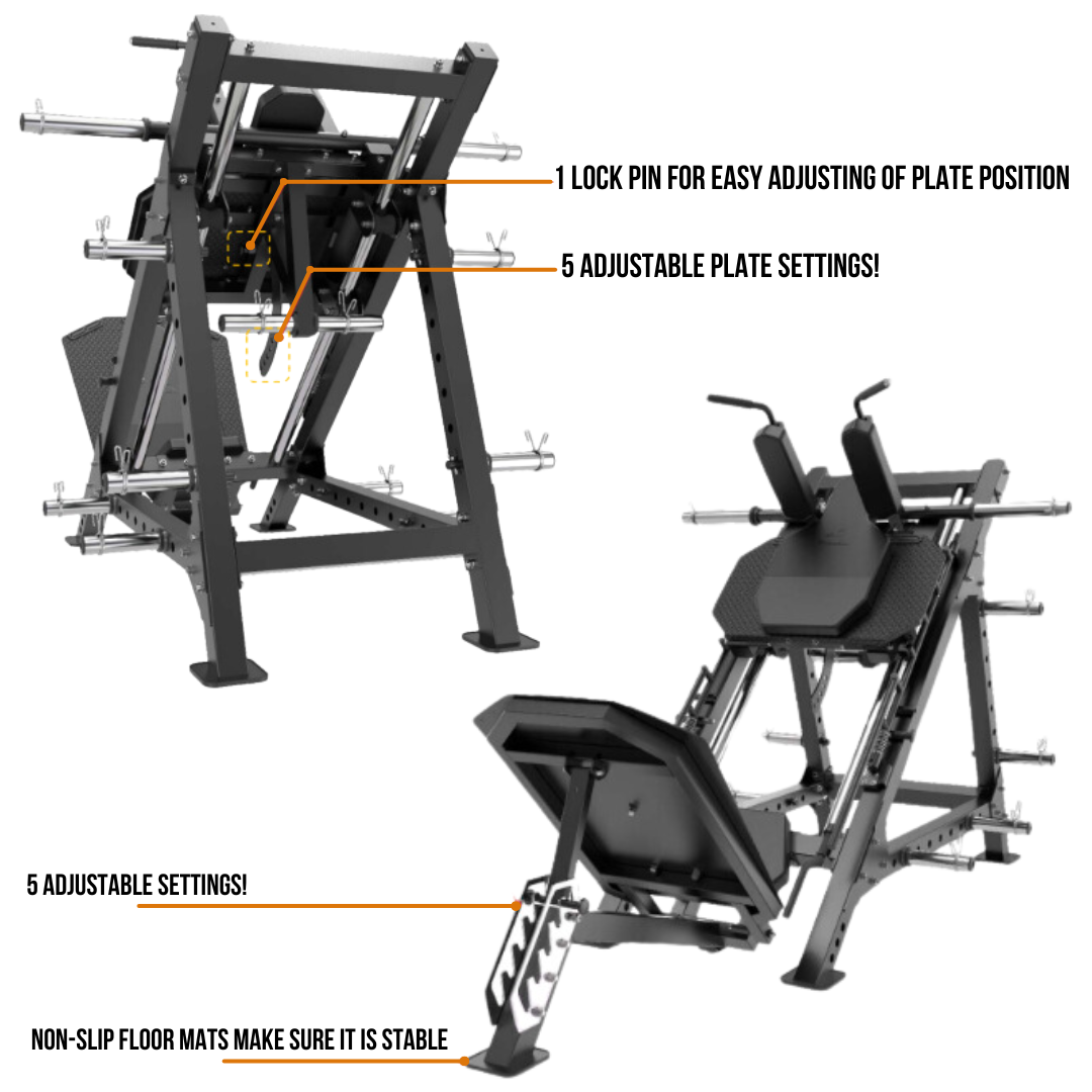 The Leg Press & Hack Squat Combo Machine has many extra features which really stand out! Non-slip foam grips, squat shoulder pads, elastic moveable backrest, landmine + T-bar attachments and more!