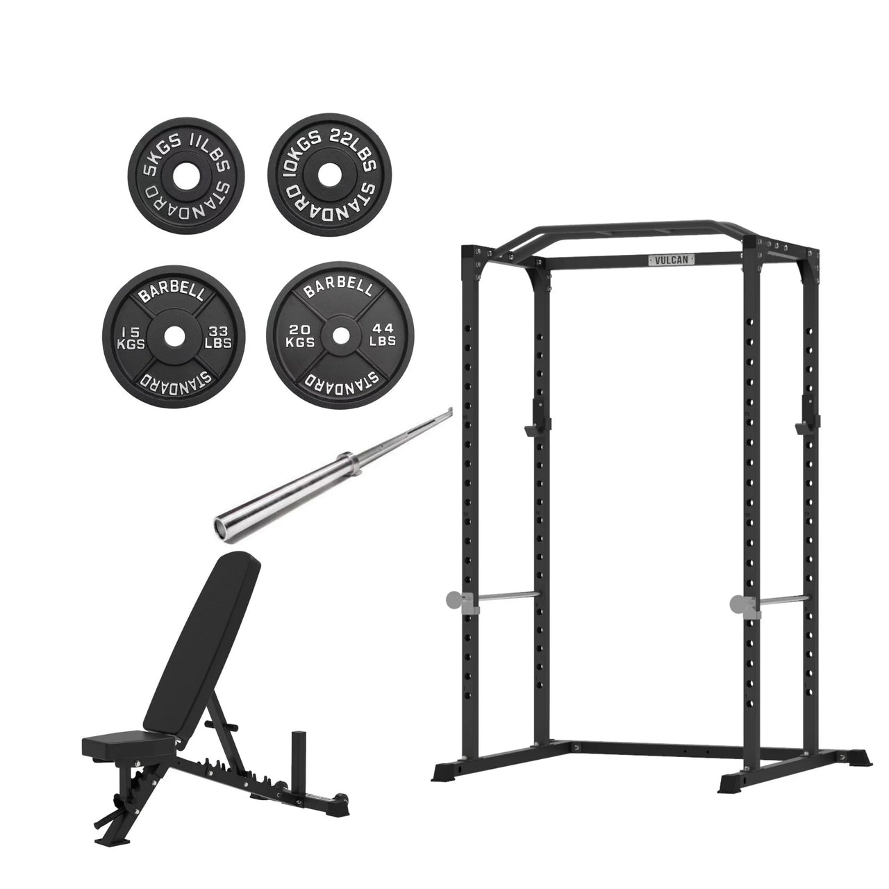 VULCAN Home Gym Power Cage, Olympic Barbell, 100kg Machined Olympic Iron Plates & Pro Adjustable Bench | IN STOCK