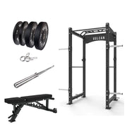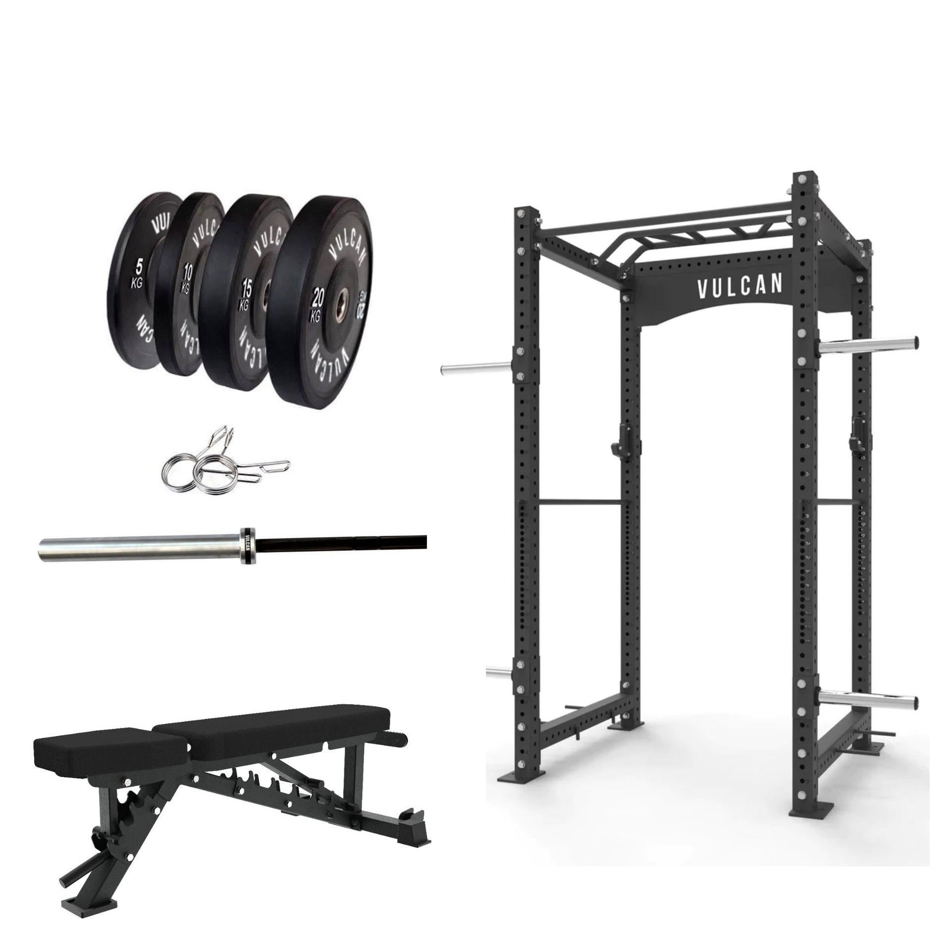 VULCAN Commercial Power Rack, Olympic Barbell, 100kg Black Bumper Weight Plates & Pro Adjustable Bench | IN STOCK
