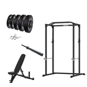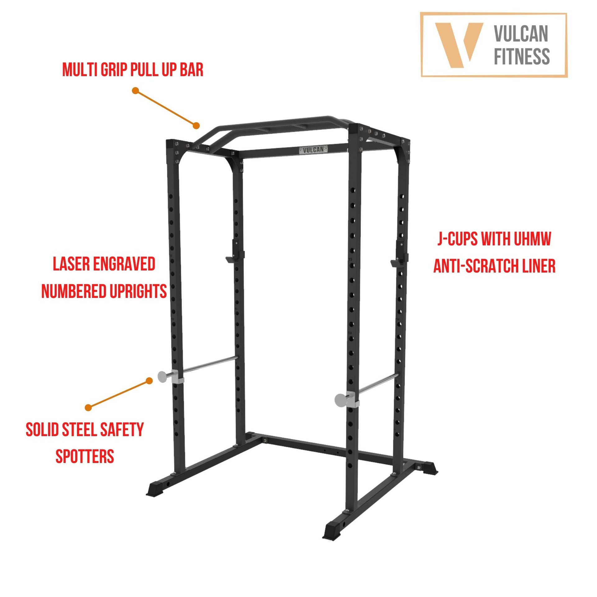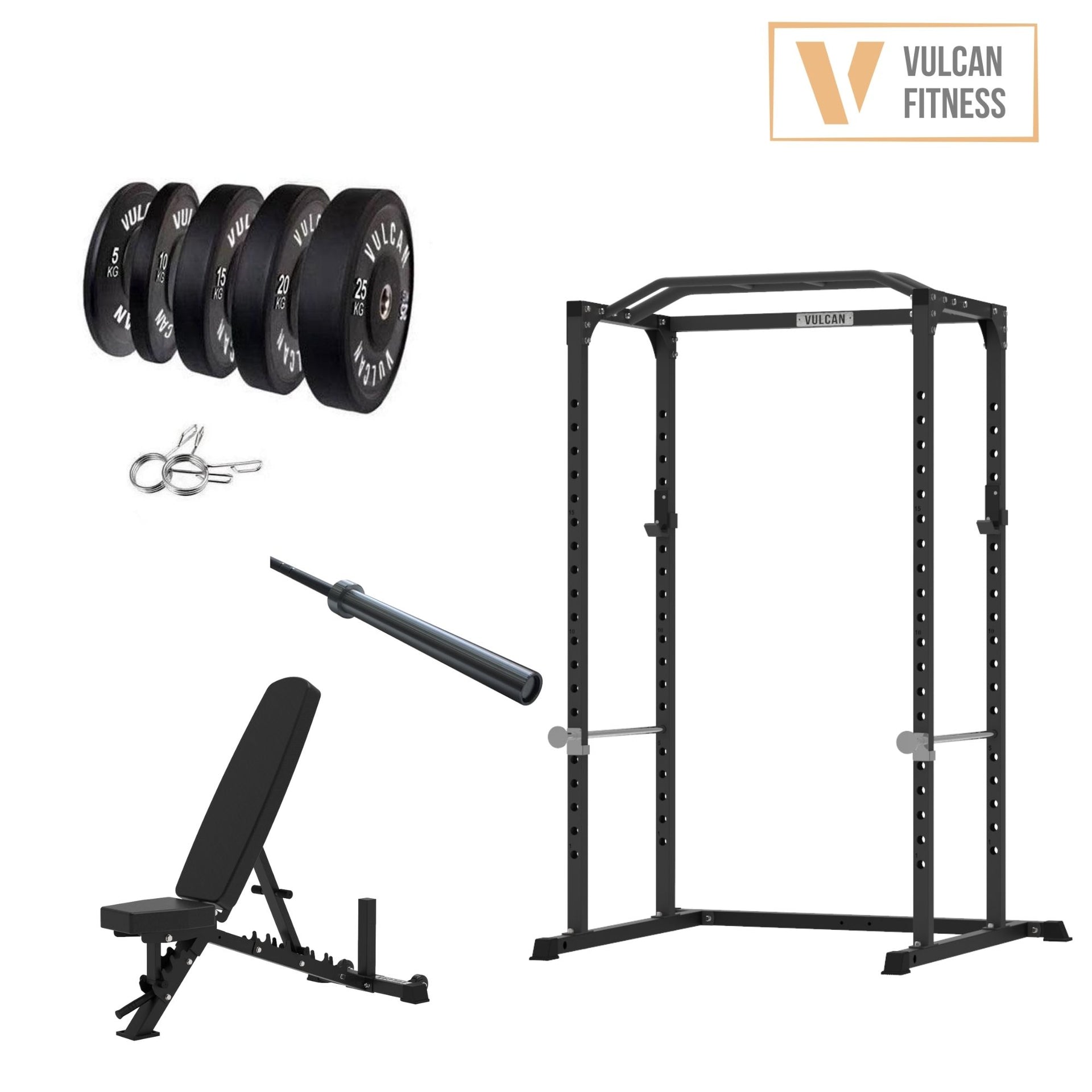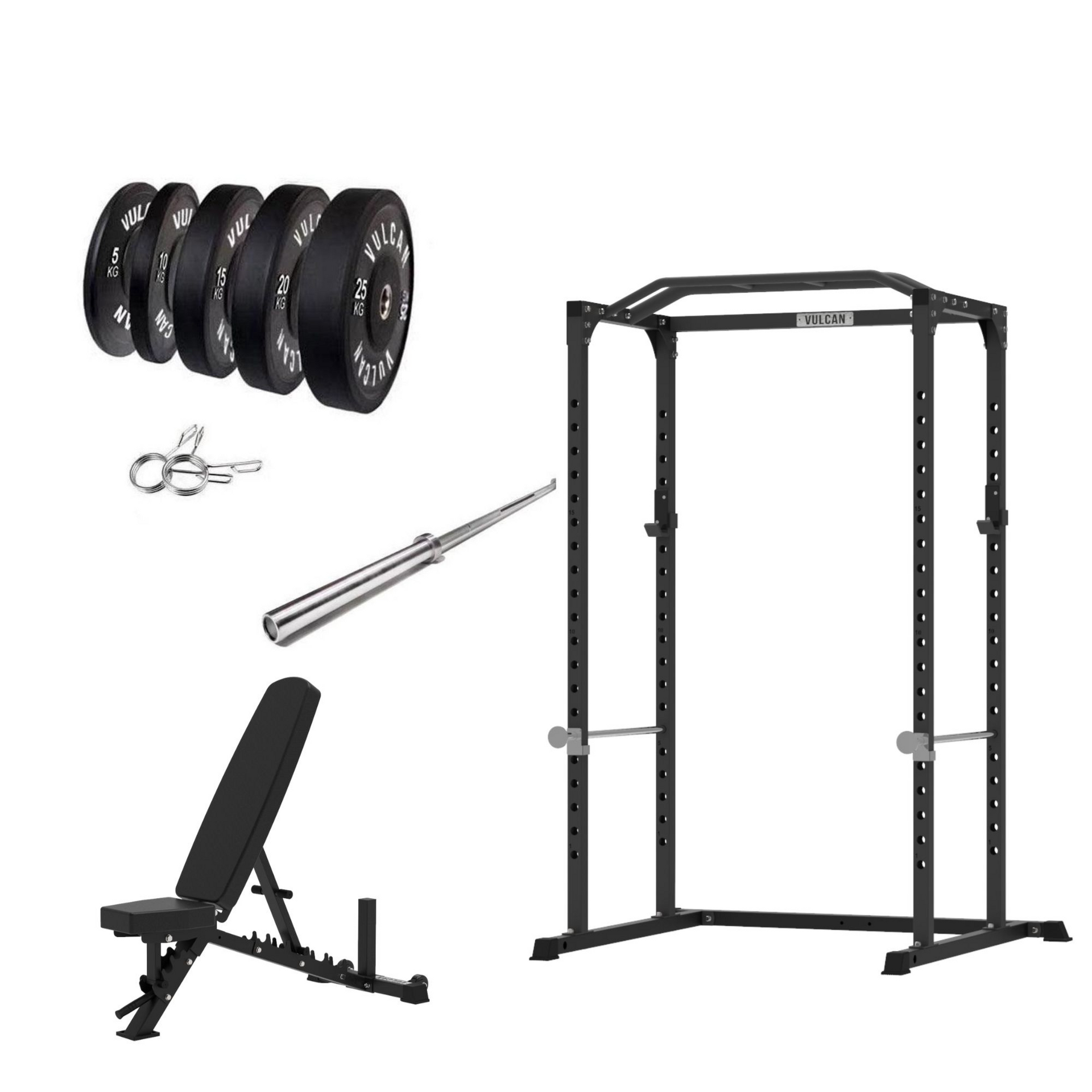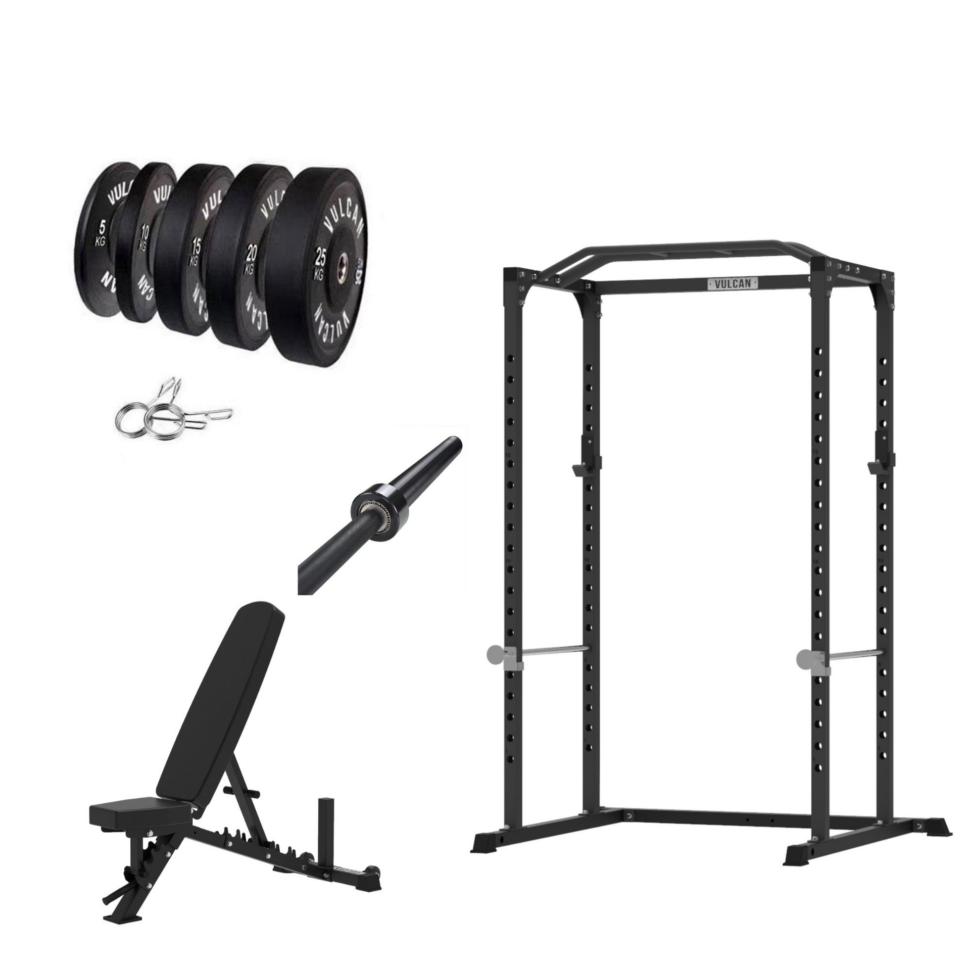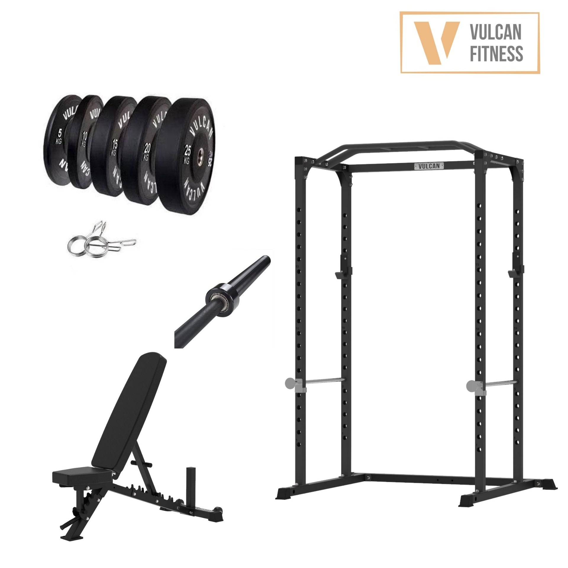 VULCAN Home Gym Power Cage, Olympic Barbell, 150kg Black Bumper Weight Plates & Pro Adjustable Bench | IN STOCK